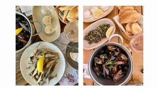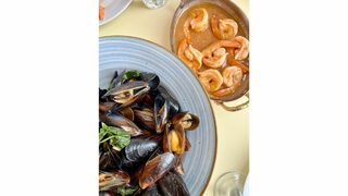 Звънецът от кухнята ме връща обратно на малката синьо-бяла масичка. Нашата поръчка - черноморски миди, тарама и скариди. Сочни, наситени, прелестни. И те, и мидите. Виното ме отпуска, картината от преди минути се завръща, а комбинацията от сочните морски дарове прави този августовски следобед абсолютно съвършен.