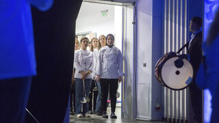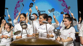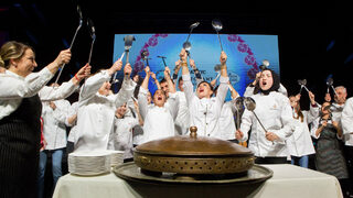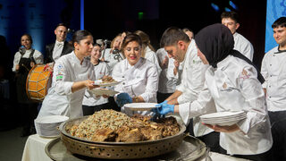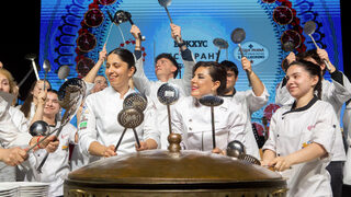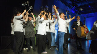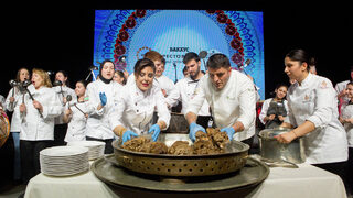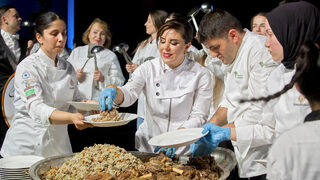 Шеф Демир и екипът готвачи се появиха пред сцената с по черпак в ръце, широки усмивки и с танцова стъпка заобиколиха огромния казан, в който беше сготвено агнешкото с пилаф.